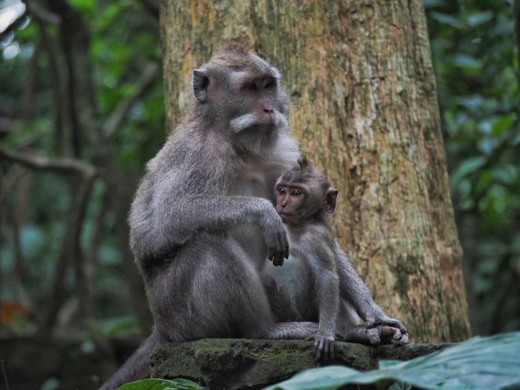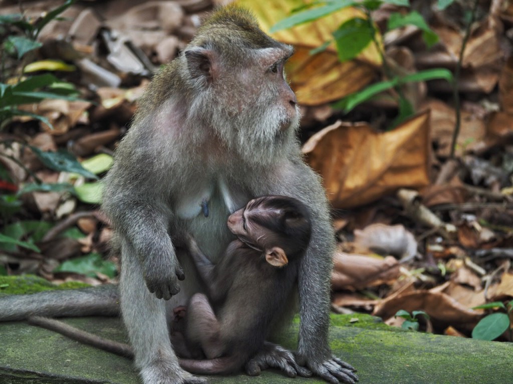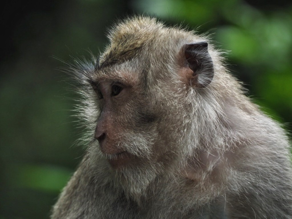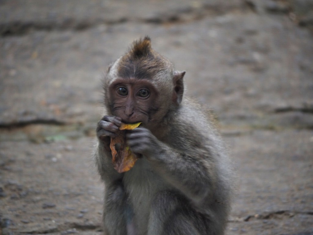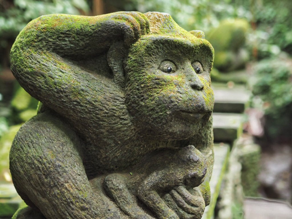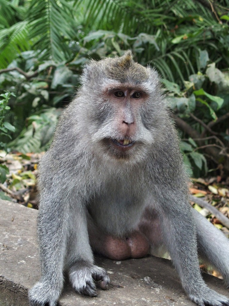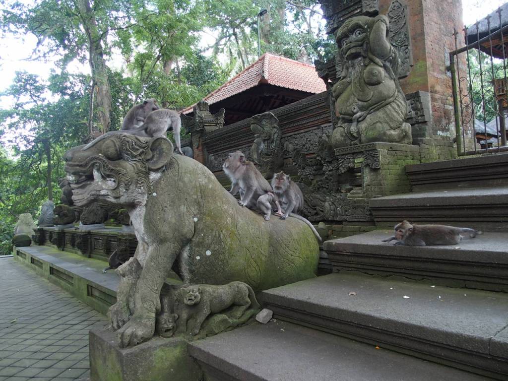 Our last stop was at the Monkey Forest, which is just a short walk from our hotel. Another small fee and we were surrounded by countless primates screeching, hopping and playing with sticks. Only some of them spoke English but they all seemed to be enjoying having monkeys (Balinese long tailed monkeys, Macaca fascicularis) running and playing and sometimes jumping up on their shoulders and heads. We walked around the temple complex and watched the monkey antics while taking pictures. Of course we can’t go to one of these semi-wild monkey things without one of us getting attacked. A dominant male chased all his brethren away and ended up perched on the path railing next to me (G). I started to aim my camera at him and he clearly became agitated. I put the camera down but now even looking his way set him off. I decided to just walk past him at which point he grabbed my shirt and screamed, baring his teeth. He kept yelling as I pulled away and glanced back but he had made his point and stayed where he was. Of course I was too chicken to get his picture.