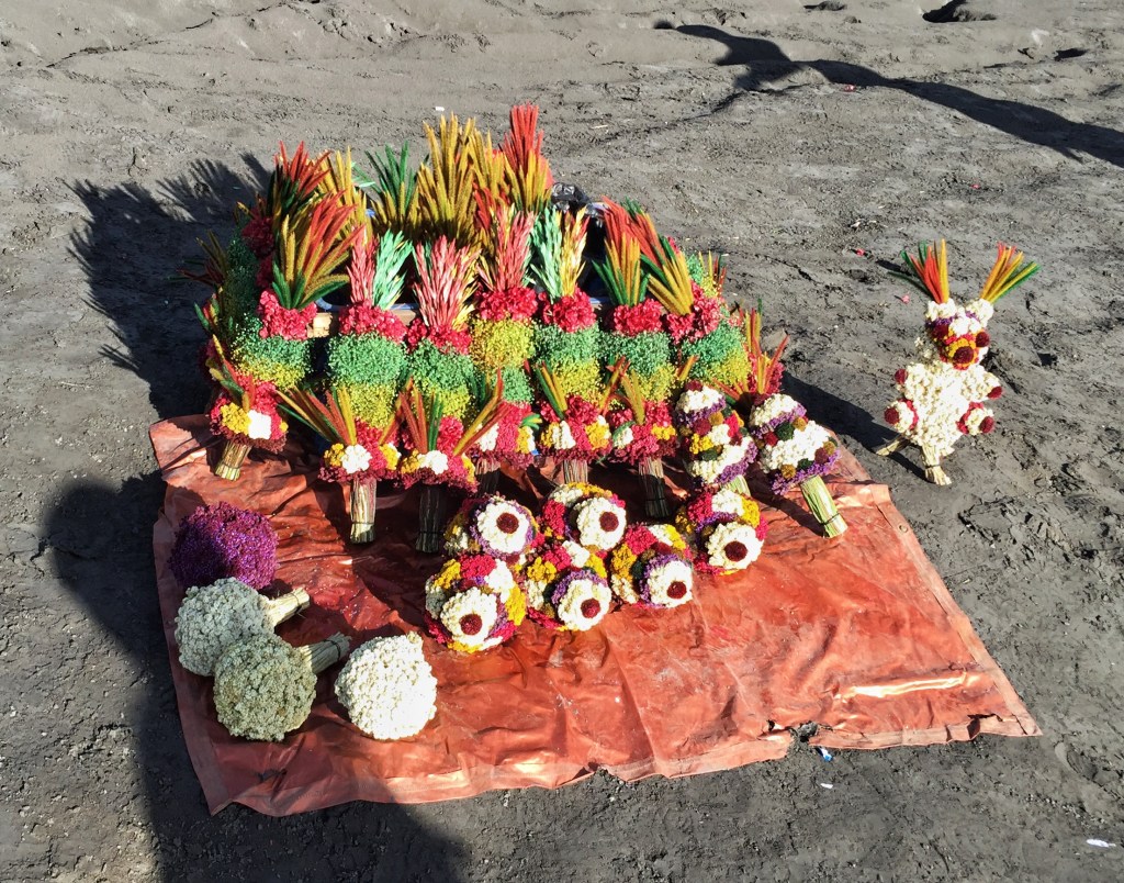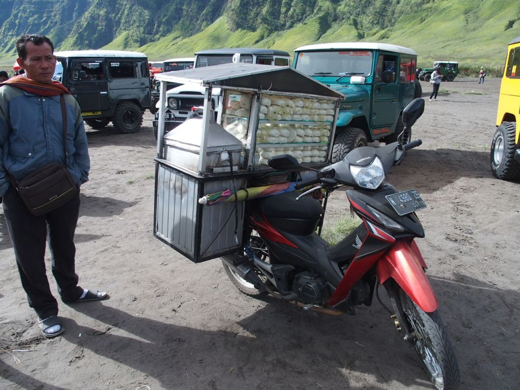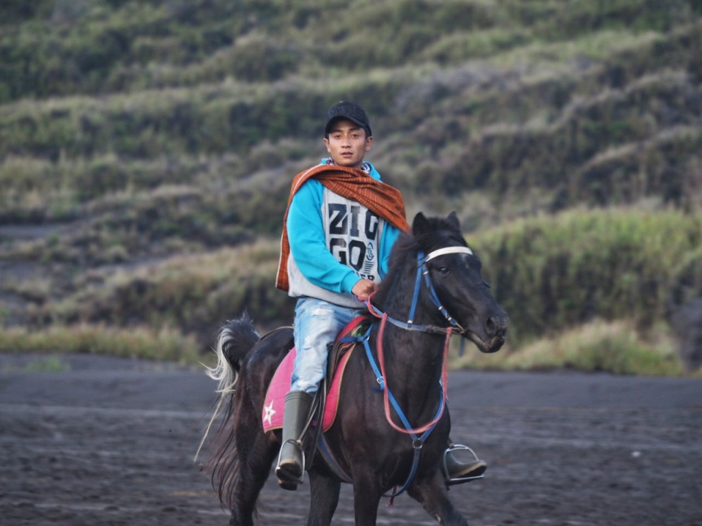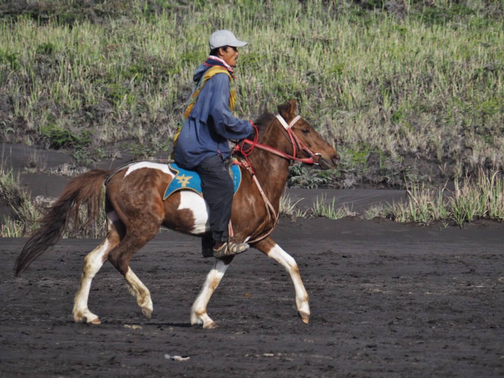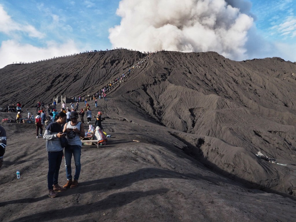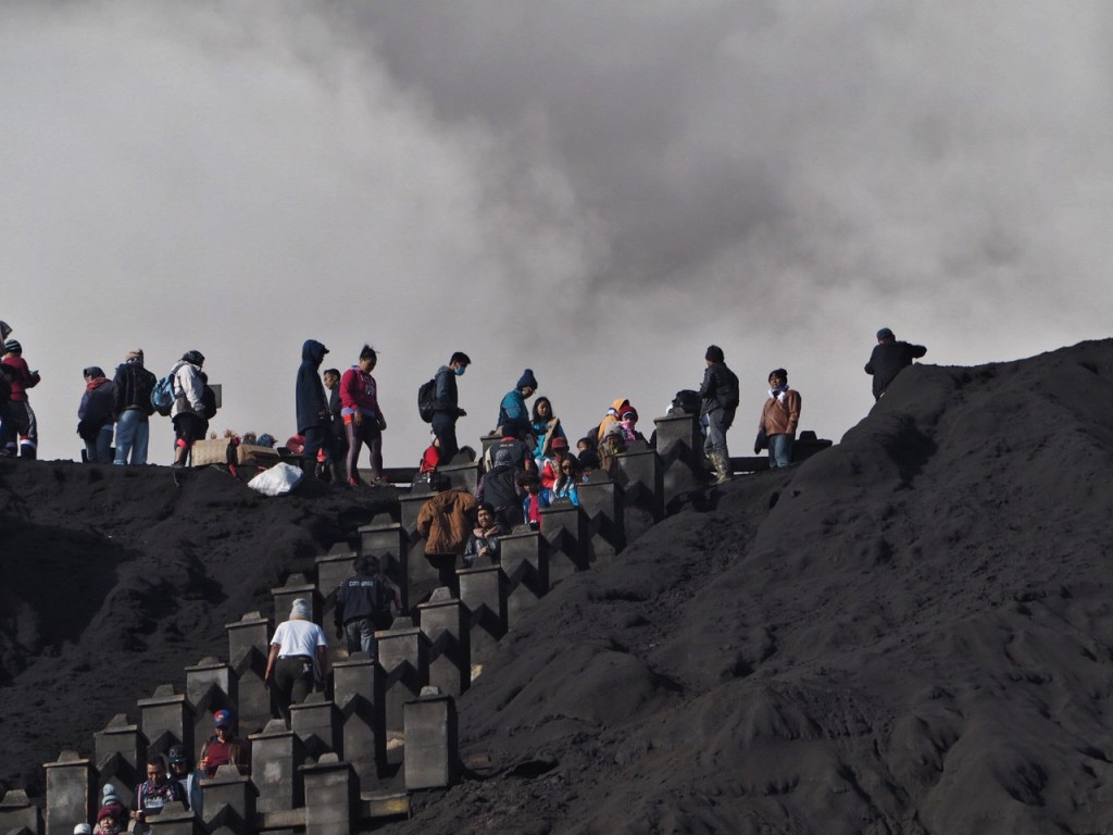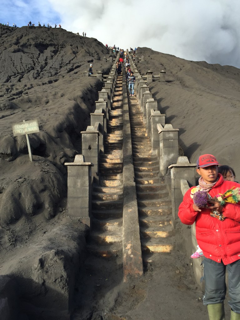 At the crater floor, it was a very lively scene with jeeps coming and going, Tengger horsemen riding around offering rides to visitors who weren’t up for or fit enough to walk to the top of Bromo and hawkers selling snacks, cheap souvenirs, and brightly colored dried flowers to chuck into the steamy abyss as an offering to the gods.