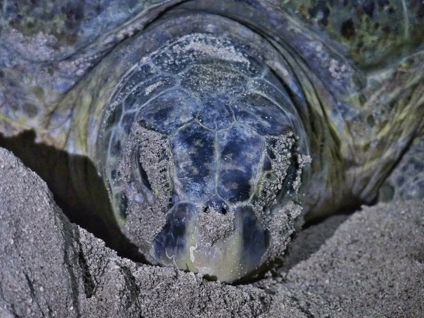 It was unknown when we would see a turtle laying her eggs. It can be anytime and you are advised to not leave the dining area until then. About the time we were finishing dinner word came down that a turtle was laying eggs on the beach and was ready for viewing. We were told we were lucky that it was early. Yes there’s that word again. We hurried out and converged on the beach where a large green turtle was laying her eggs. The rangers scooped the eggs into a bucket as quickly as she dropped them, and when she was done she swept sand into the empty nest. In total she laid 74 eggs. We were allowed to surround her to witness and take pictures of the event. Of course there were some people who had to take a selfie with the turtle while she was in labor.