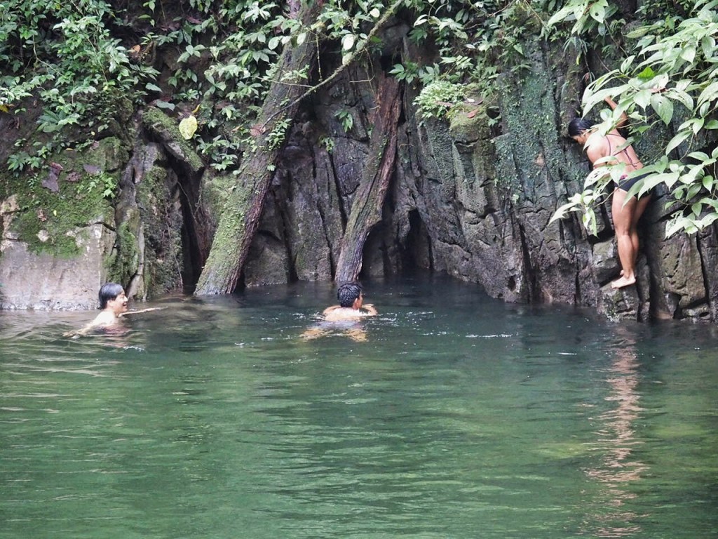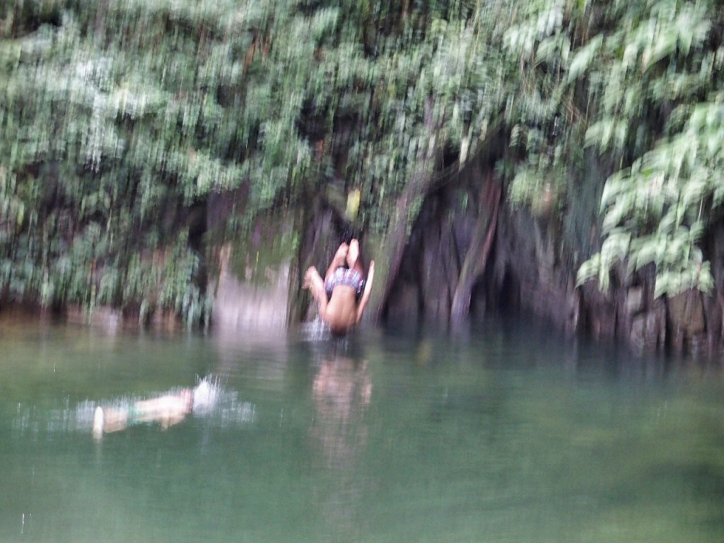 Afterwards, people were allowed to swim in the river outside the cave. Bay, Sally & Colby stripped down to their swimwear and jumped in. Of course, Sally and Colby decided to climb up the cliffs and do some dives and flips which got them hollered at by our guide.