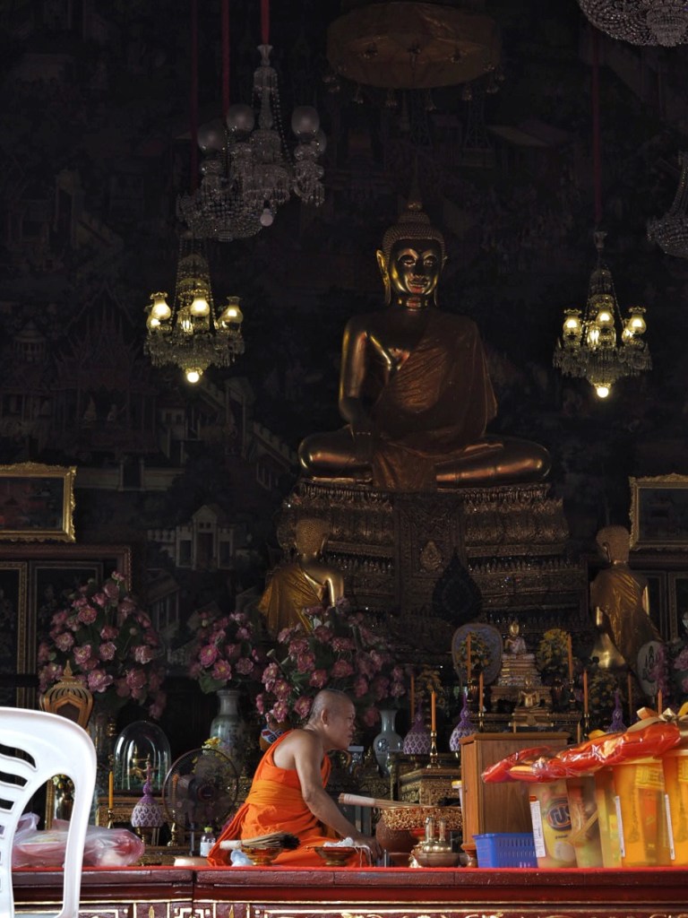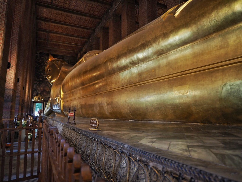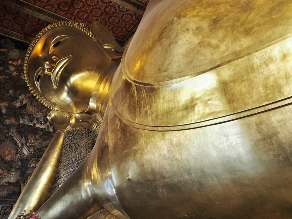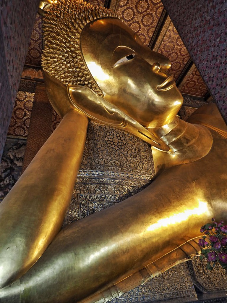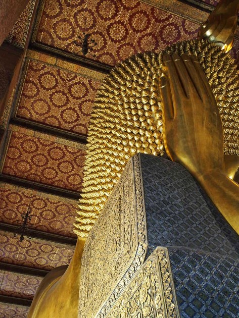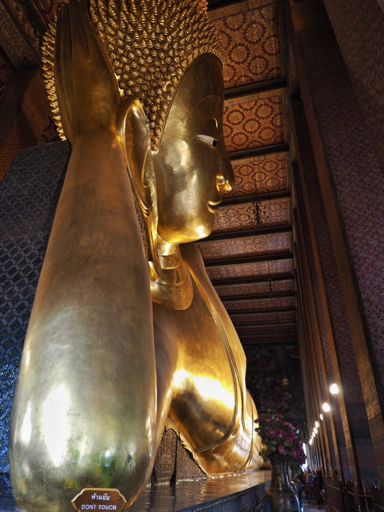 Did you know that there is a reclining Buddha in Wat Pho? Duh! It’s like a gigantor Buddha measuring about 50 feet tall, 150 feet long and all covered in gold leaf.