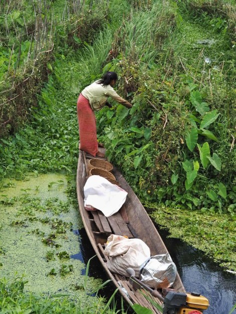 Walking the bikes on the bridge, we got to see how villagers pick tomatoes from the floating gardens. Harvesting is a serious adventure when done from a canoe. The lady we were watching came dangerously close to falling out of her canoe several times.