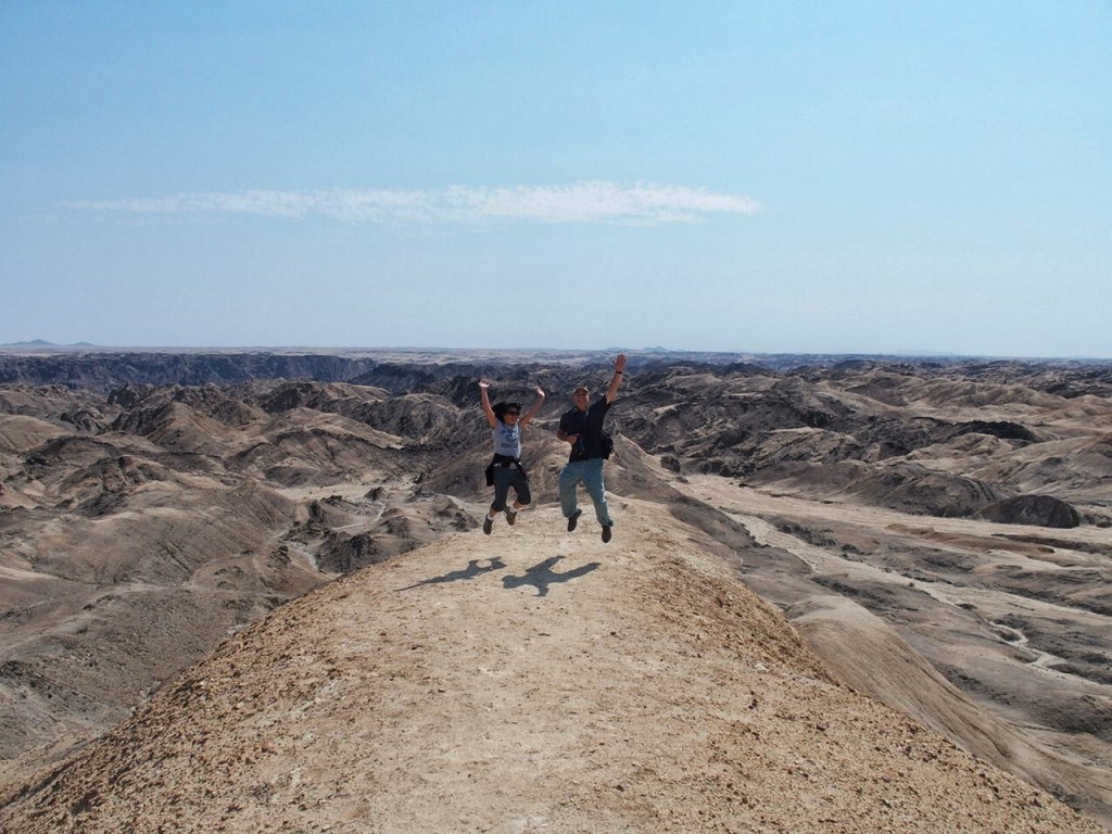 We went back to Twyfelfontein to pick-up the guide to find the elephants. The guide who we originally spoke to bailed on us and asked some other guide to show us the elephants. Whatever, as long as we can find the elephants. As it turned out, we would have never been able to find these elephants on our own as getting there involved driving completley off the main road into a dry riverbed. G was struggling with the off-road driving and drove too slowly for our guide’s taste. Wanting to make sure we got back before sunset, our guide took the wheel from G and showed us all how a skilled driver handles a 4WD on the back roads.