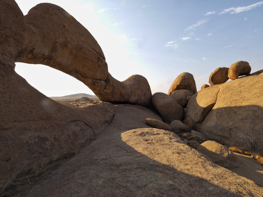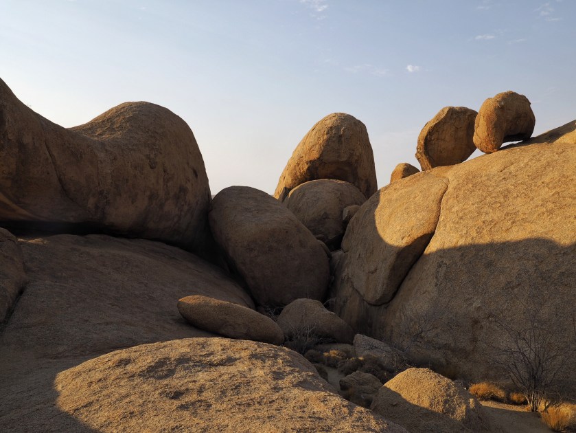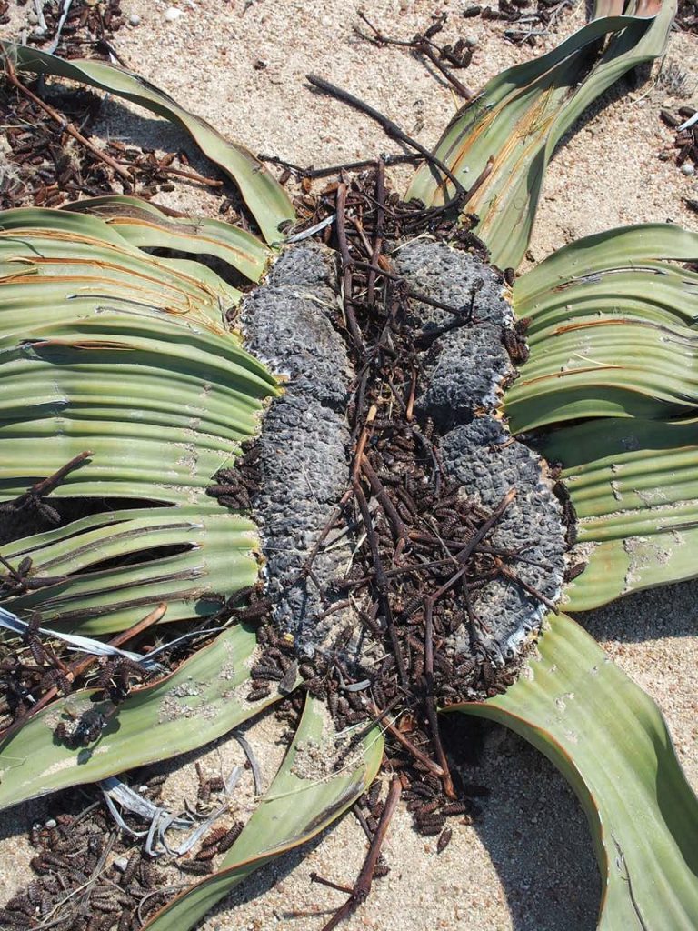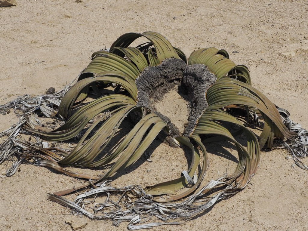 After stopping off to hike around the dry washes, we proceeded further east on the backroads in search of the weird and bizarre Welwitschia trees. These are “trees” that don’t grow vertically and live up to 2000 years. They only ever have two leaves, a stem base and roots. That’s it. The leaves get shredded over time by winds giving the impression that there are more than two leaves. The pic on the right was my attempt at channeling my inner Georgia O’Keefe.