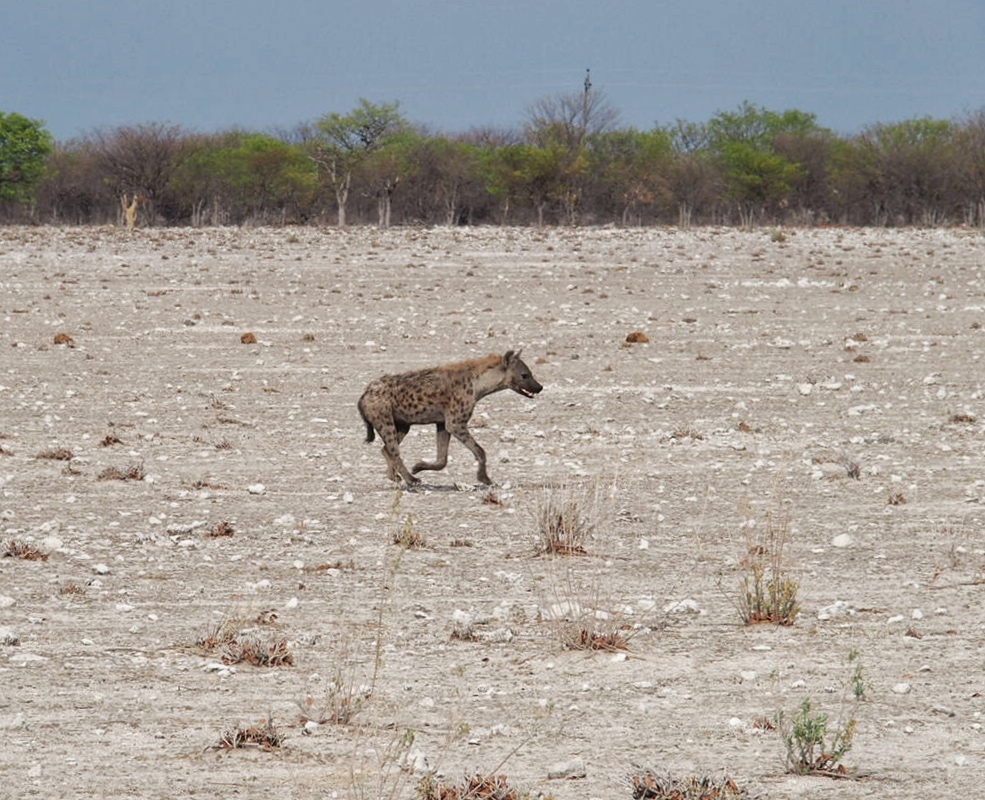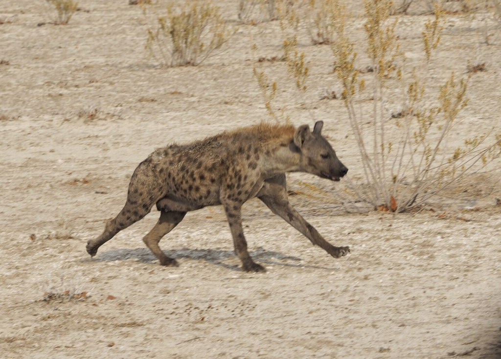 Spotted hyena bounding across the plains near the Okaukeujo entrance.