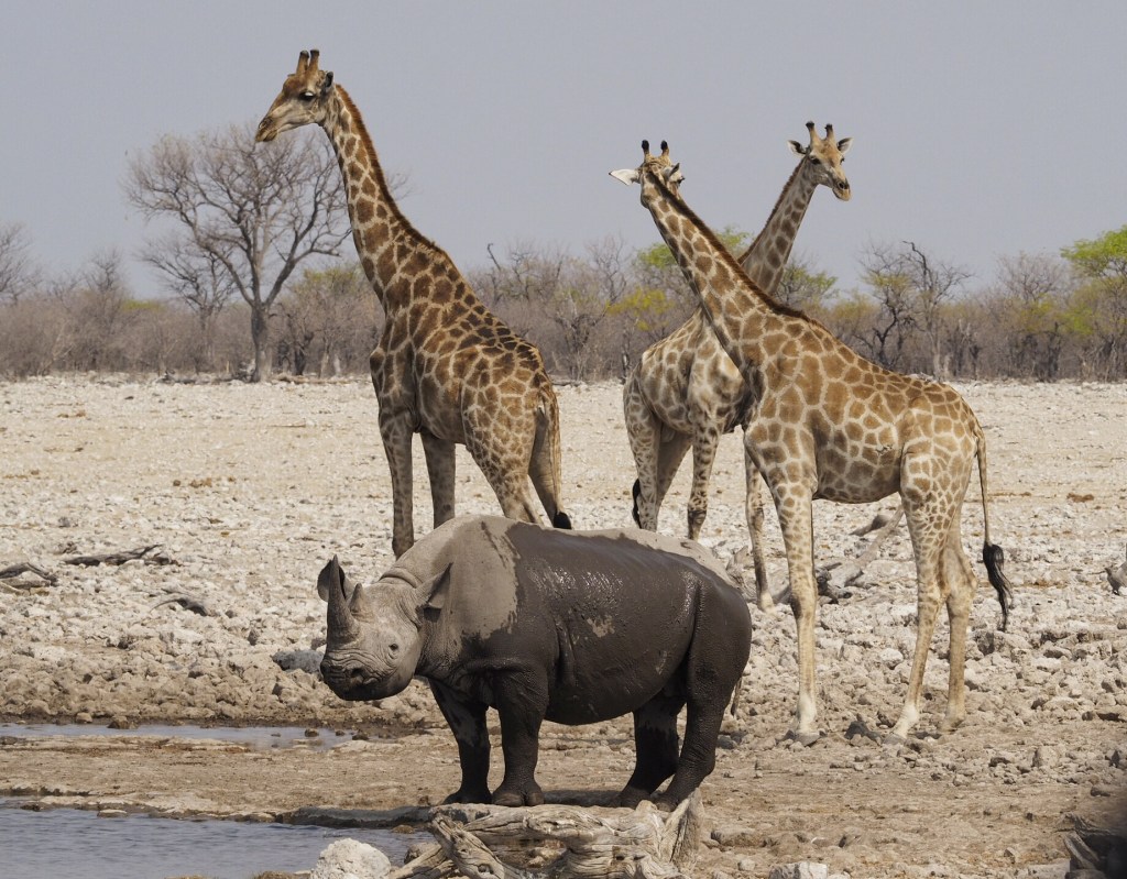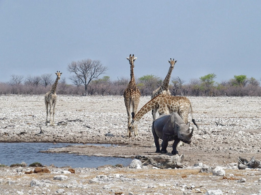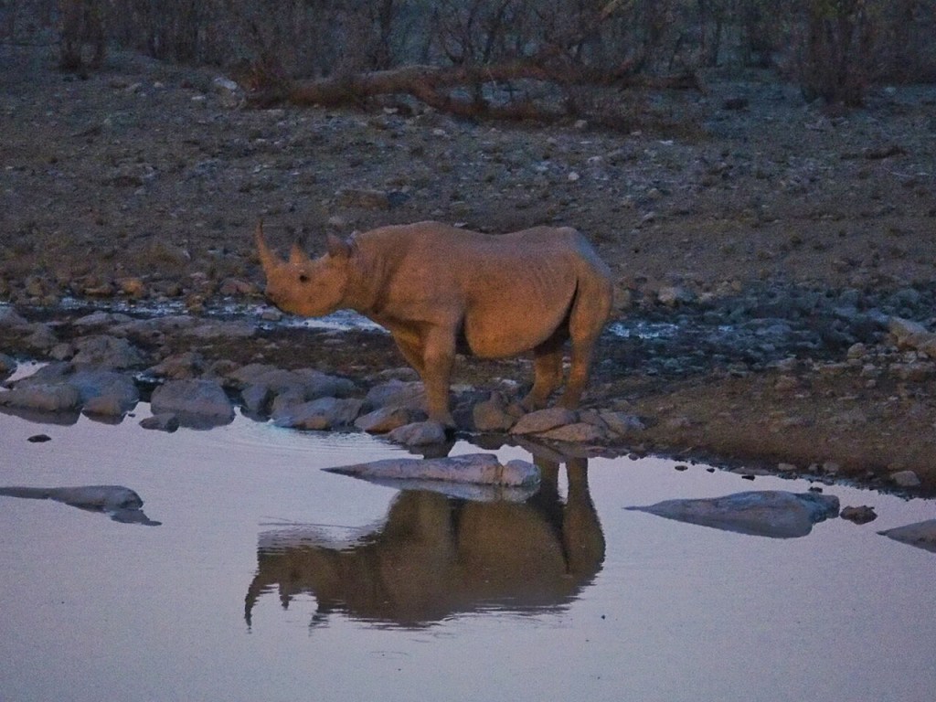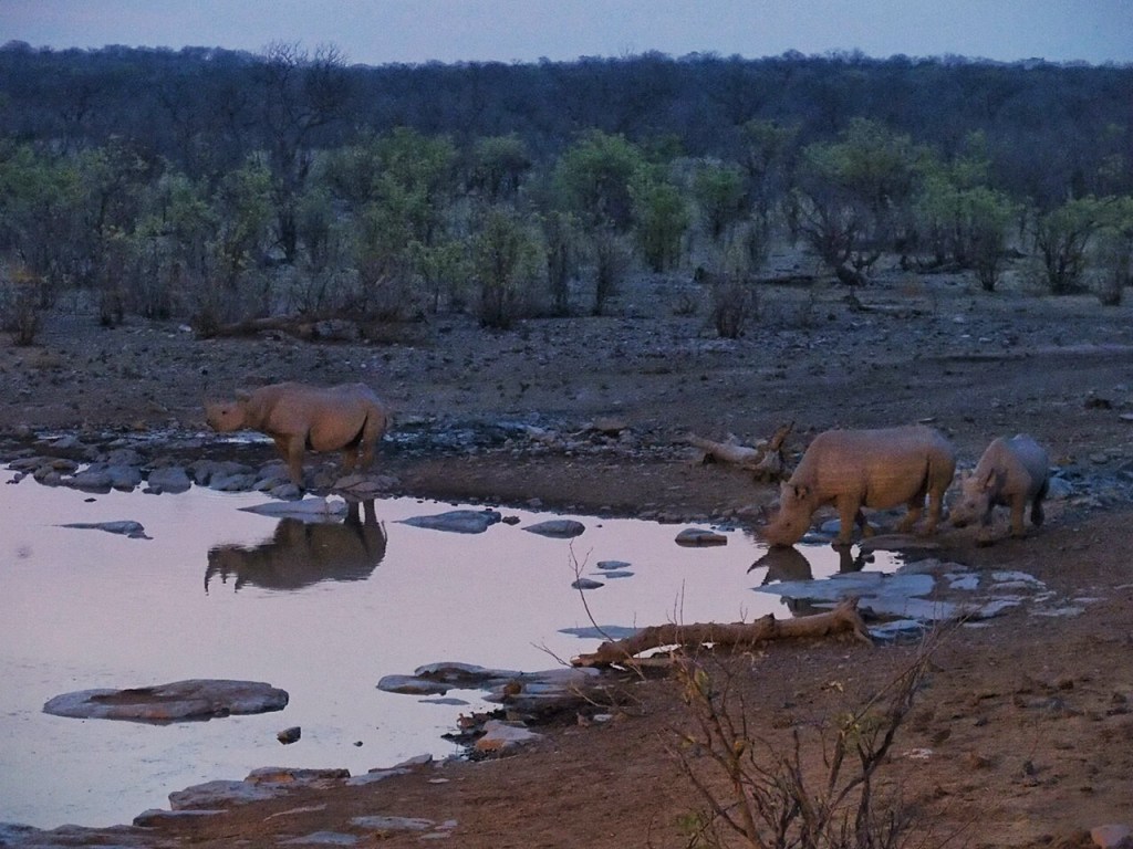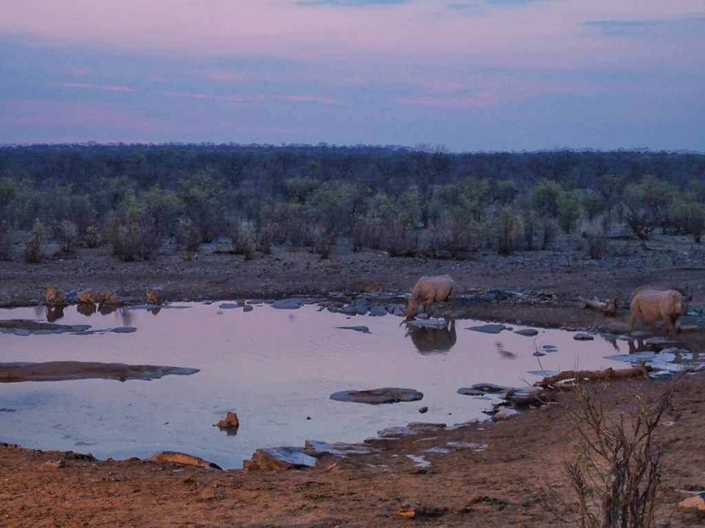 A black rhino and her baby. Both of them chasing the lions away from the waterhole. Later on six rhinos showed up.