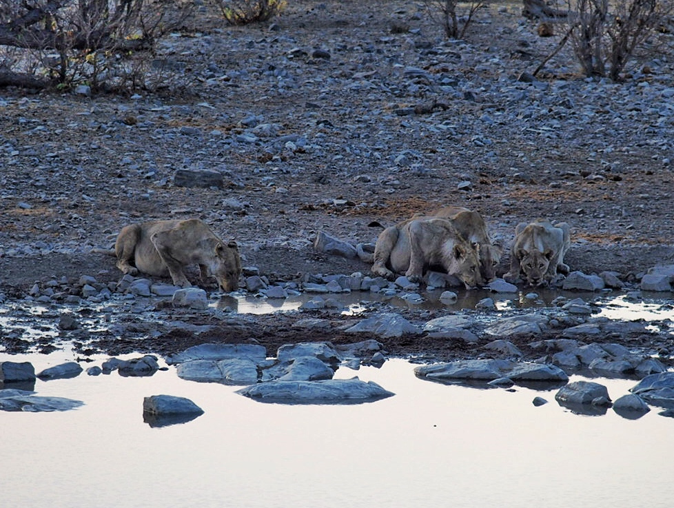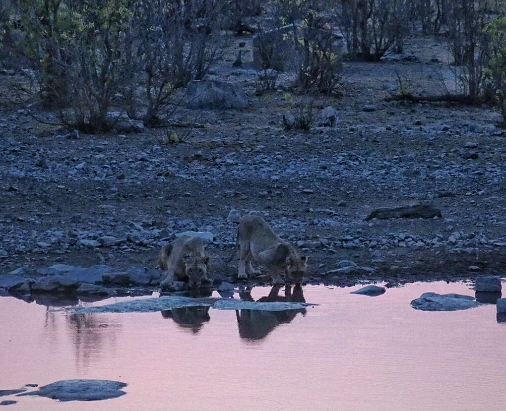 At the Halali Waterhole, we saw two prides of lions drinking and hanging out. They appeared to be two mothers and their cubs.