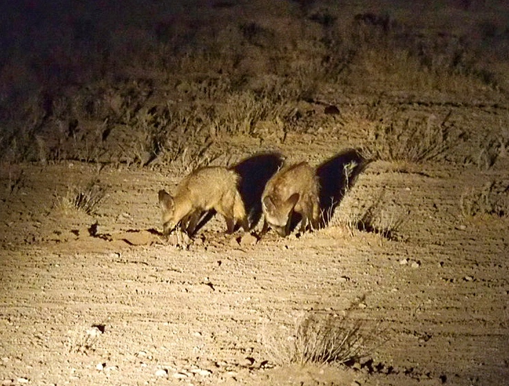 Guided morning and night drives: Bat-eared Foxes, an Aardwolf, resting antelopes with their eyes reflecting our light in the dark, Rhinos, Jackals, and a likely African Wild Cat. Aren’t the bat-eared foxes cute?