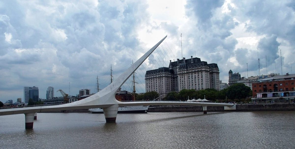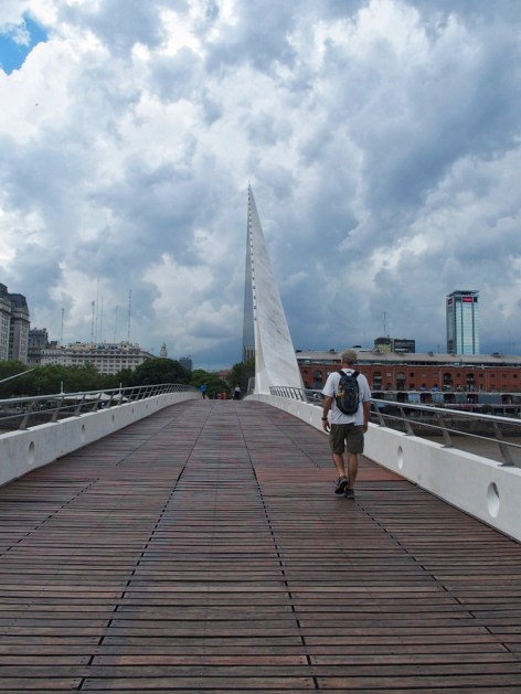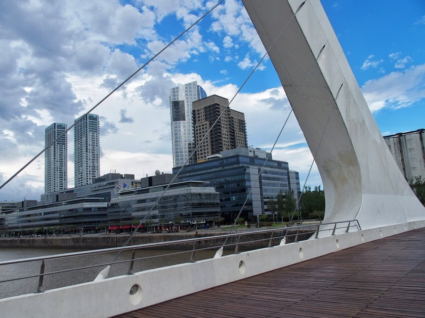 Afterward we walked through the Parque de Mujeres Argentina and crossed the Puente de la Mujer (Women’s bridge). A number of streets in Puerto Madero are named after women thus giving the bridge its name. This is an odd-looking, asymmetrical footbridge that rotates to allow boats to pass. It’s supposed to make you think of a couple dancing the tango. Sure, why not.