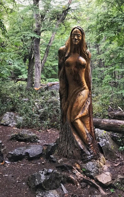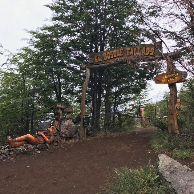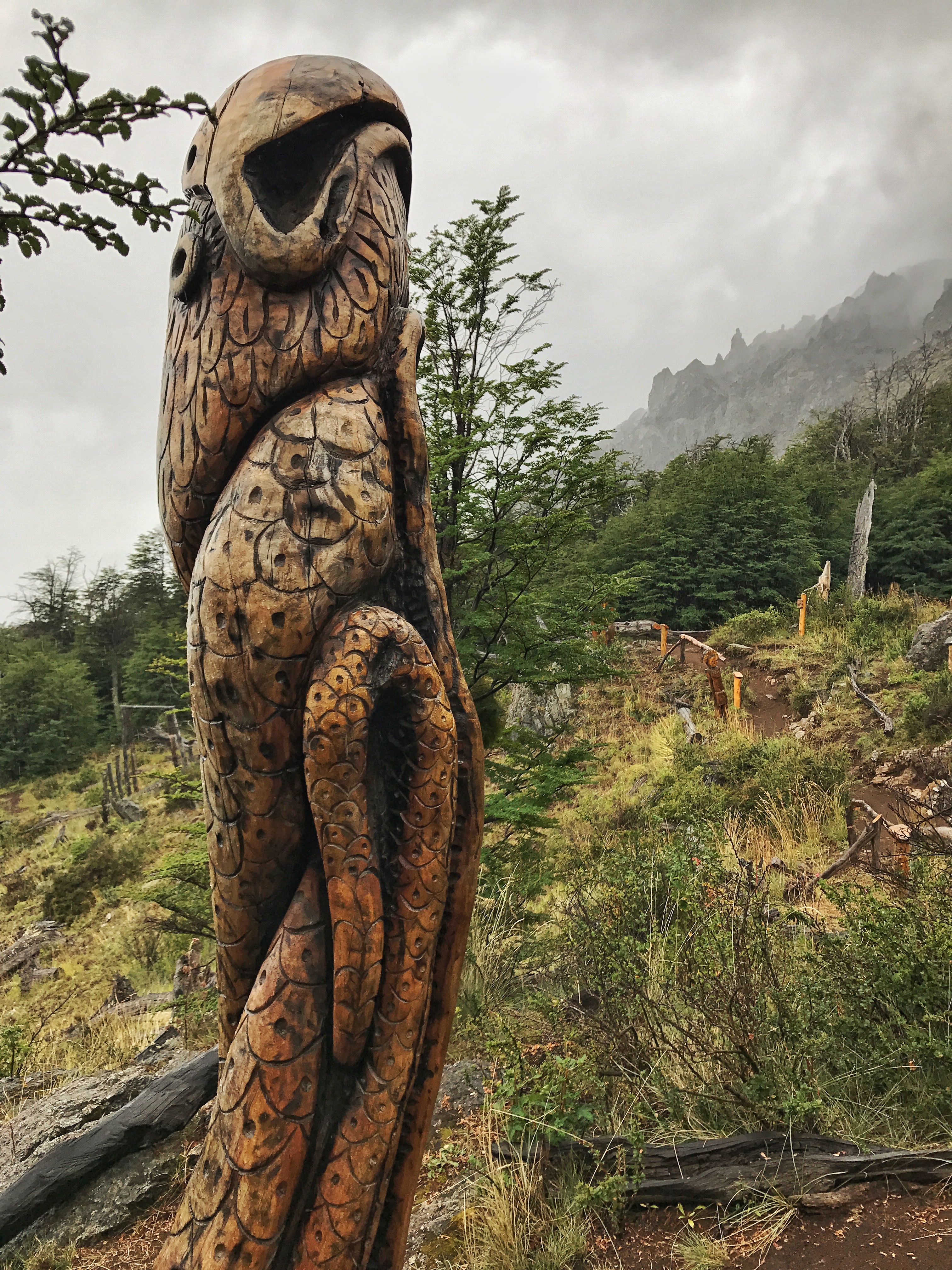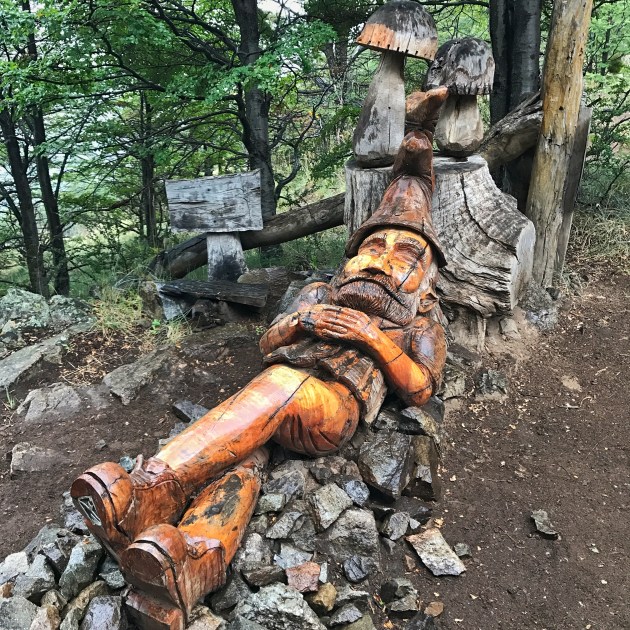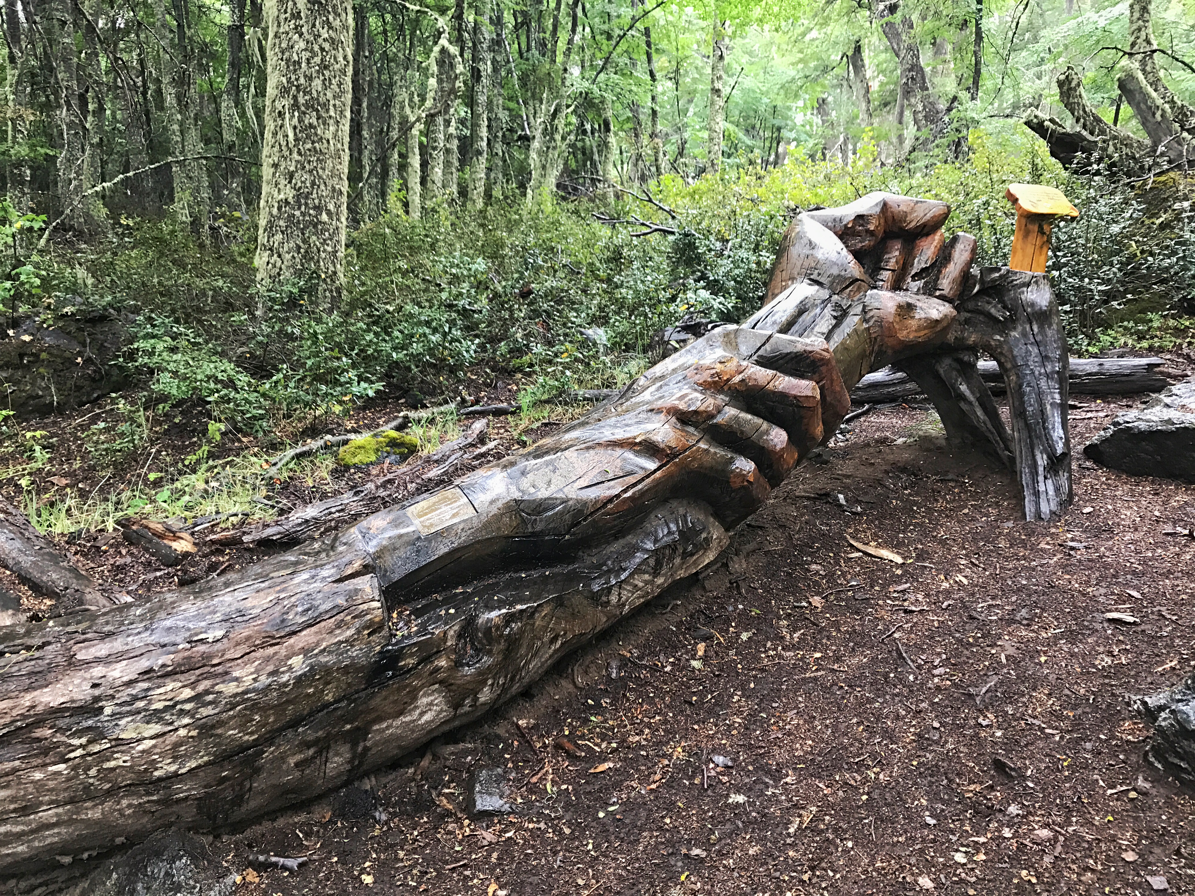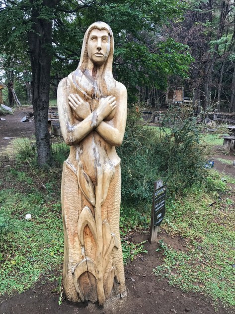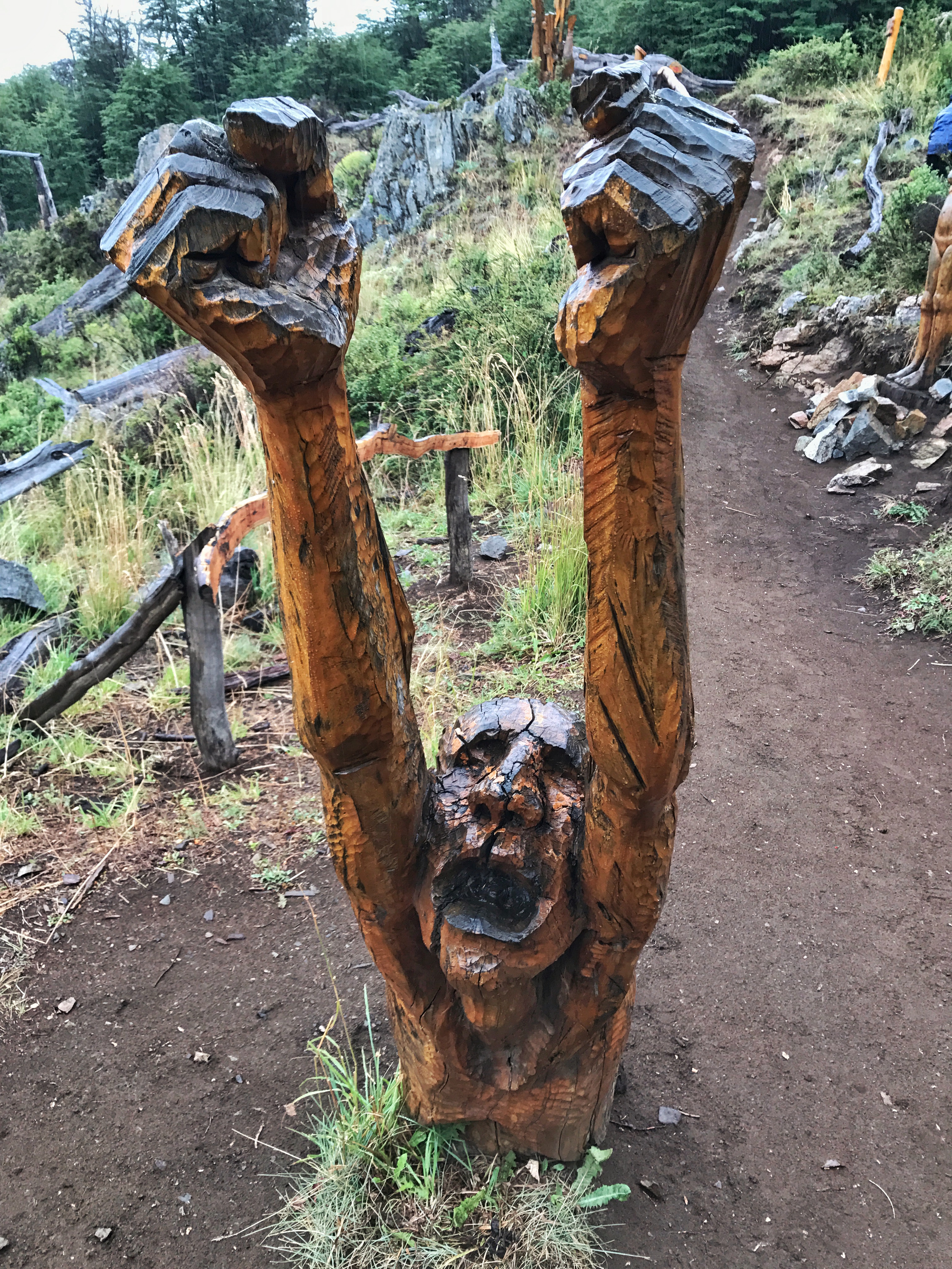 The next day it rained nonstop but we weren’t going to be denied one of the region’s coolest sights. A slow pothole-filled harrowing drive up a local mountain was followed by a steep, wet hike to the Bosque Tallado. This is a spot in the forest where dead trees were carved into standing sculptures by local artists. You can also get great views of El Bolson from here, but due to rain and low clouds we were denied.