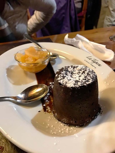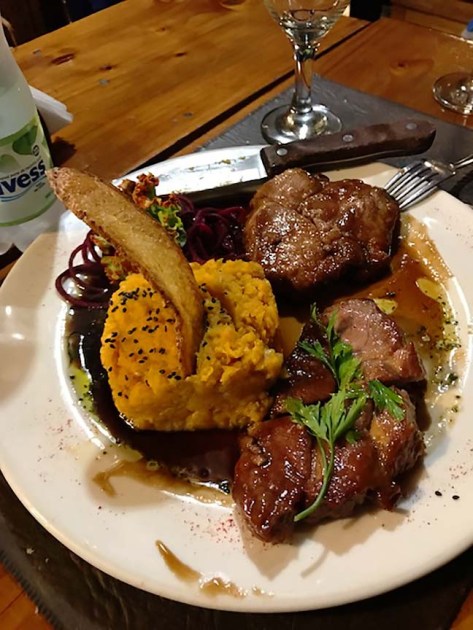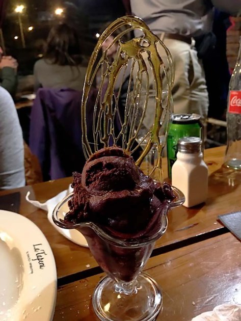 Located in a cute log cabin this excellent restaurant serves modern Argentine fare with an international twist. We had the bondiola (pork shoulder), chicken w/rice (more like fried rice than Spanish chicken and rice), and our favorite stew, locro. Tejado Negro had better locro. Dessert was Volcano Chocolate cake with calafate ice cream. Cash only.