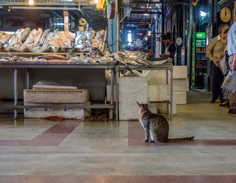 and then back to Central Market for a seafood lunch. G wanted to try Paila Marina a Chilean seafood stew and D the Pastel de Jains, Chile’s version of a crab cake. The Paila turned out to be just a seafood soup but the Pastel de Jains was like cheesy crab dip. So much richness and goodness. The best part of the Mercado, though, were the lucky market cats standing guard over their seafood stalls.