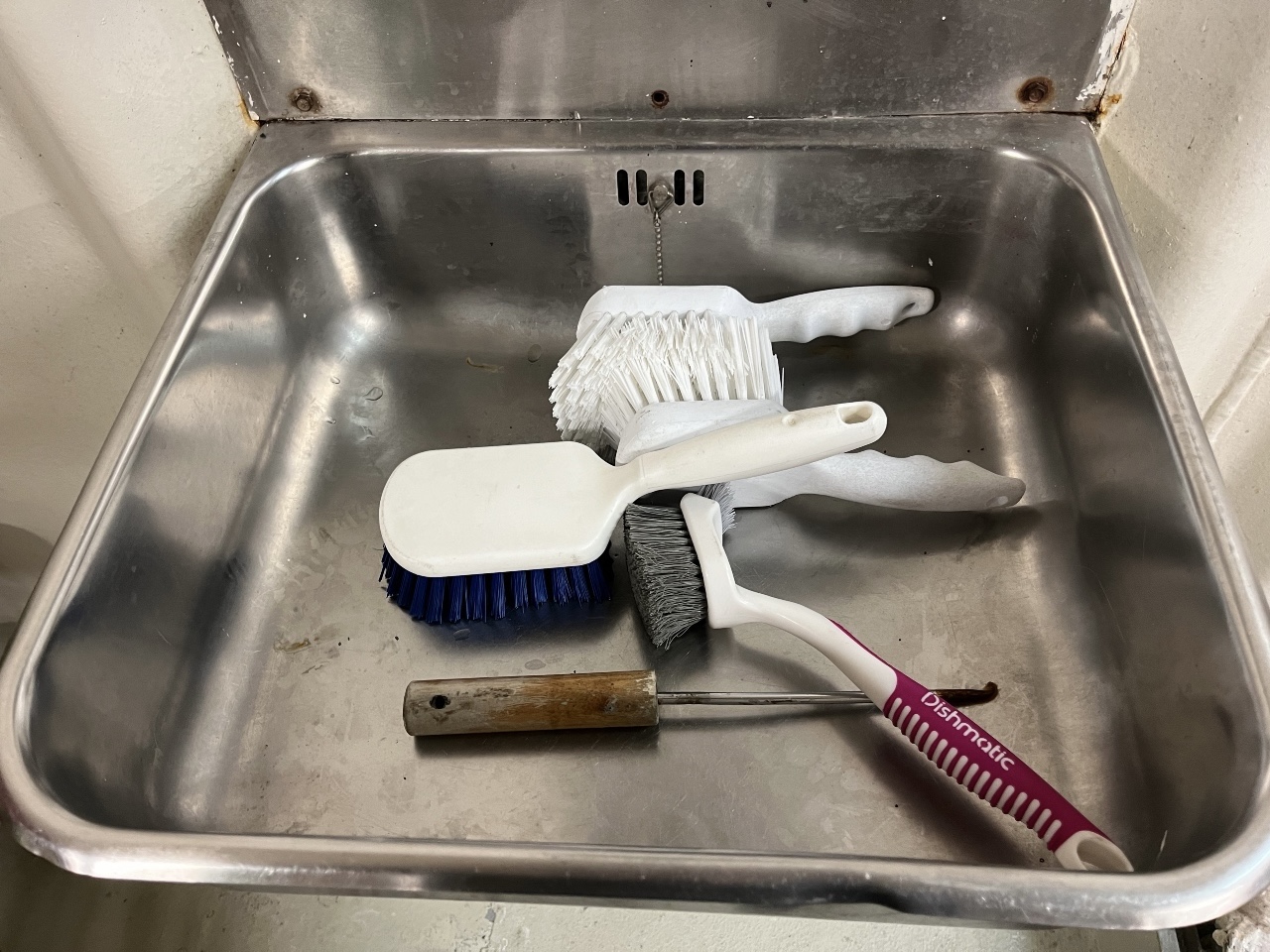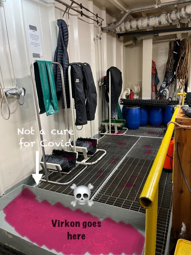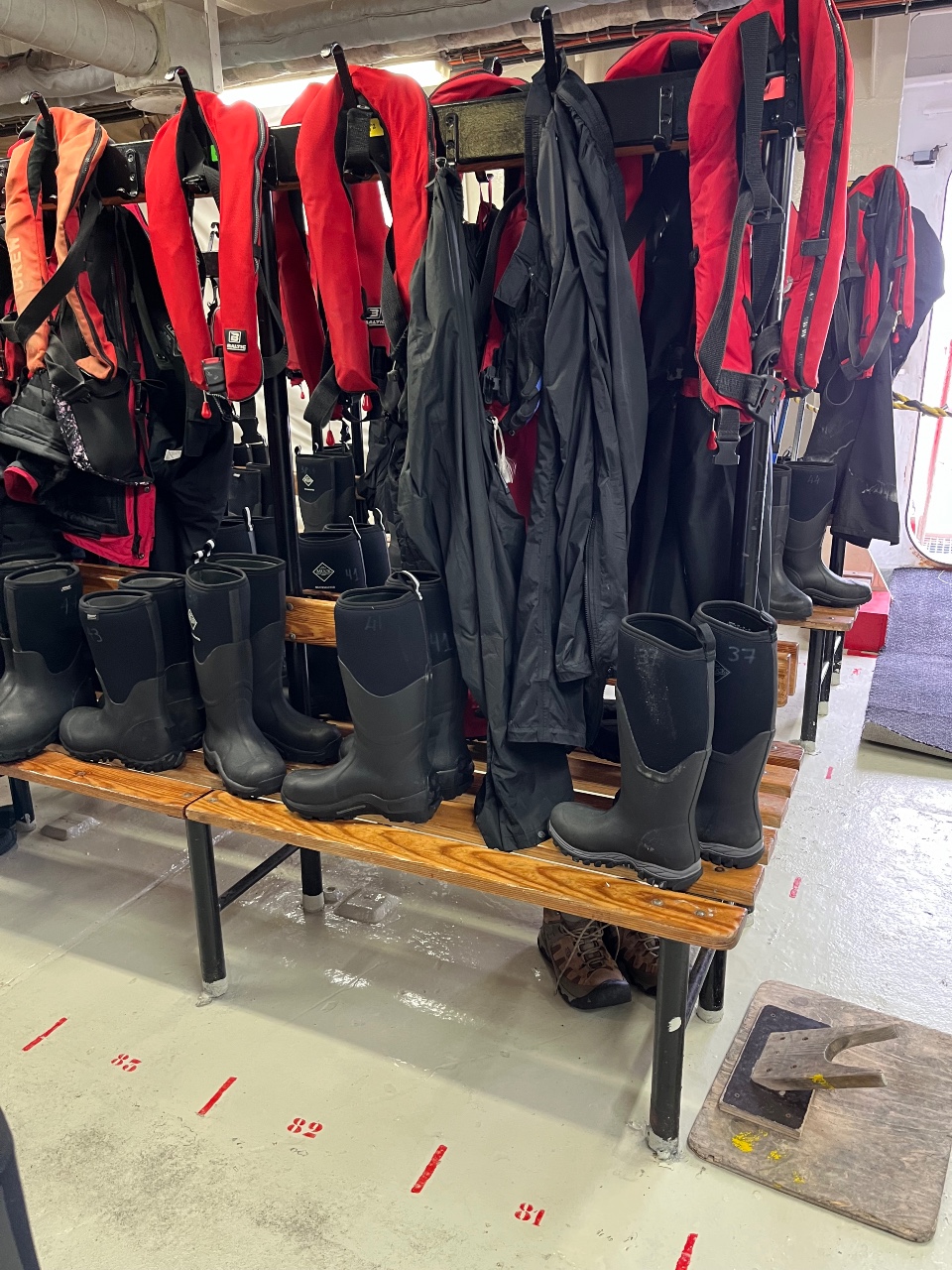 Finally, we were fitted for our Bog boots, which we would use every time we left the ship. Of course, all the small size boot (36) were already gone so Daisy had to go up the next size available (38). The boots seem a little loose, but nothing a few pairs of socks wouldn’t fix, so she was told. Not only would we need to disinfect the boots in Virkon before and after every outing, but we would also need to scrub, pick, rinse and inspect them, making sure all organic matter was gone. If they didn’t pass muster, we would be called back to the mudroom and forced to do the “mudroom walk of shame” to clean them again. That was incentive enough for us to make sure we cleaned them throughly the first time.