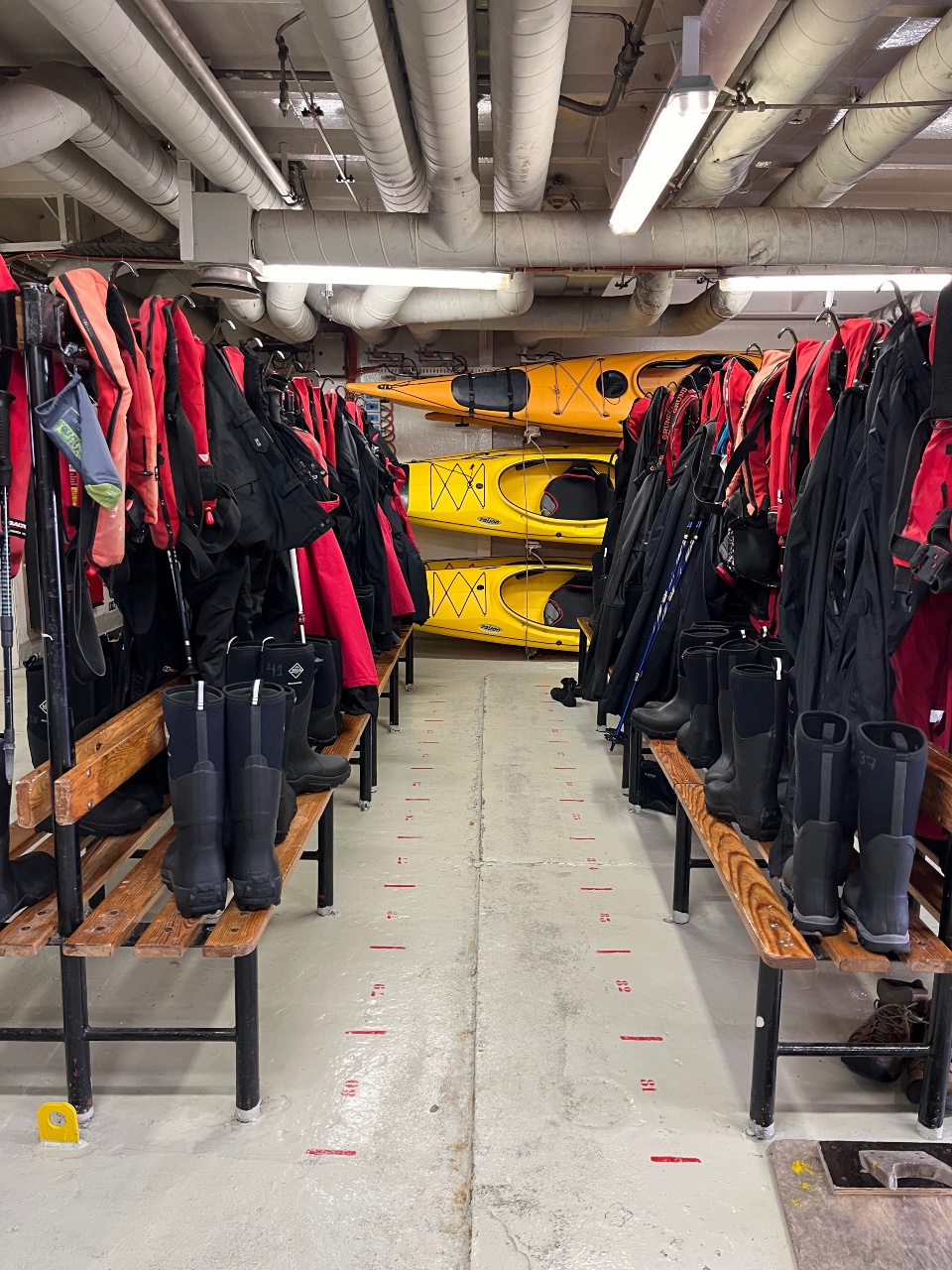 We then signed up for our Mudroom/Zodiac Group which determines the order that you go out on the expeditions. The mudroom is the staging area for all our excursions. This is where we are called down by groups to assemble and disassemble our layers of cold weather gear, disinfect and scrub our boots and poles, sign in and out with our ship id, all while getting in each other’s way. Our mudroom numbers were 80 and 81.