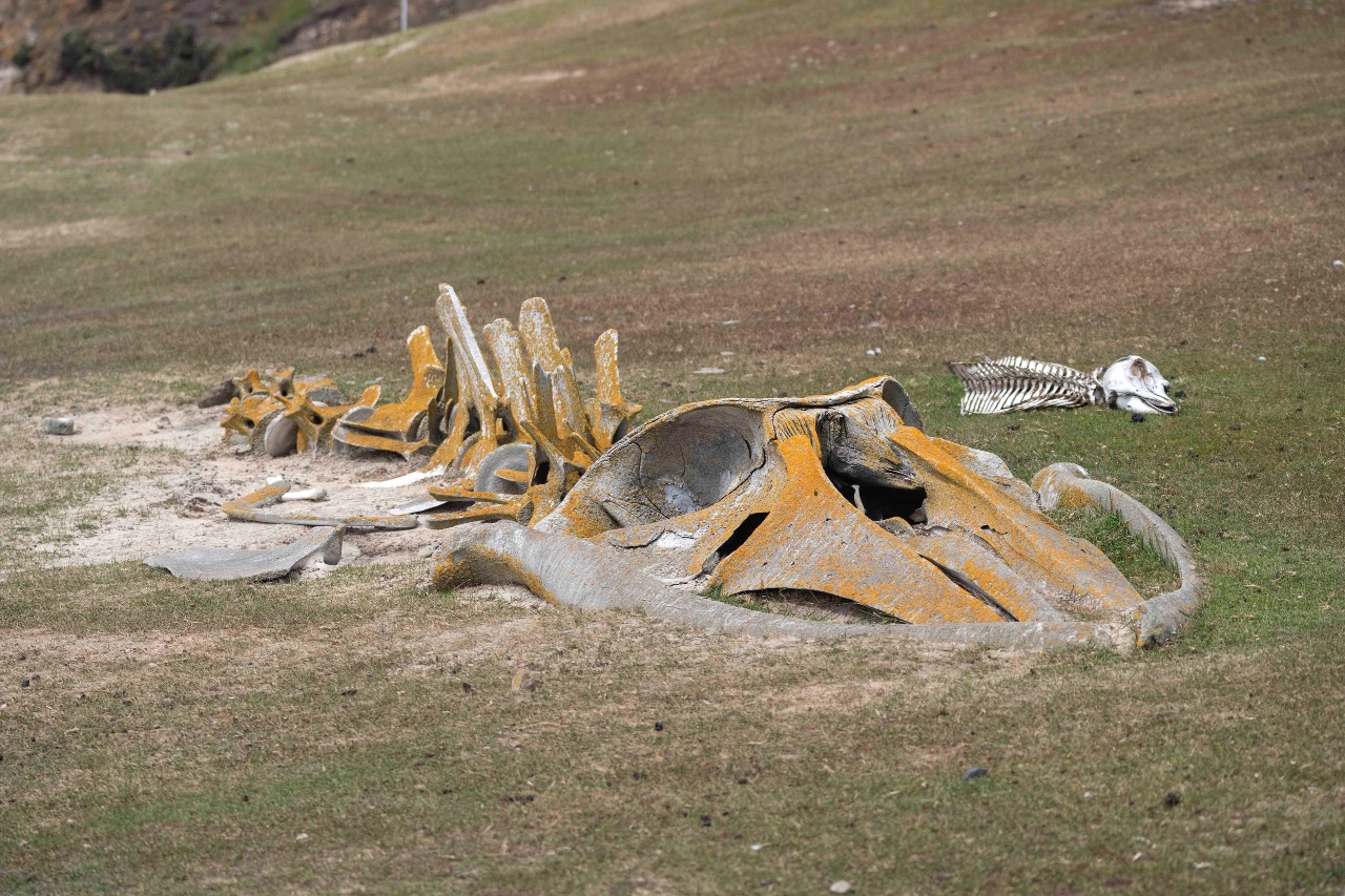 Next, we made our way to the upper shag and rockhopper nesting site on the cliffs, where we passed a frankenwhale skeleton and sheep grazing in the hills while the penguins went about their business. What a surreal scene.