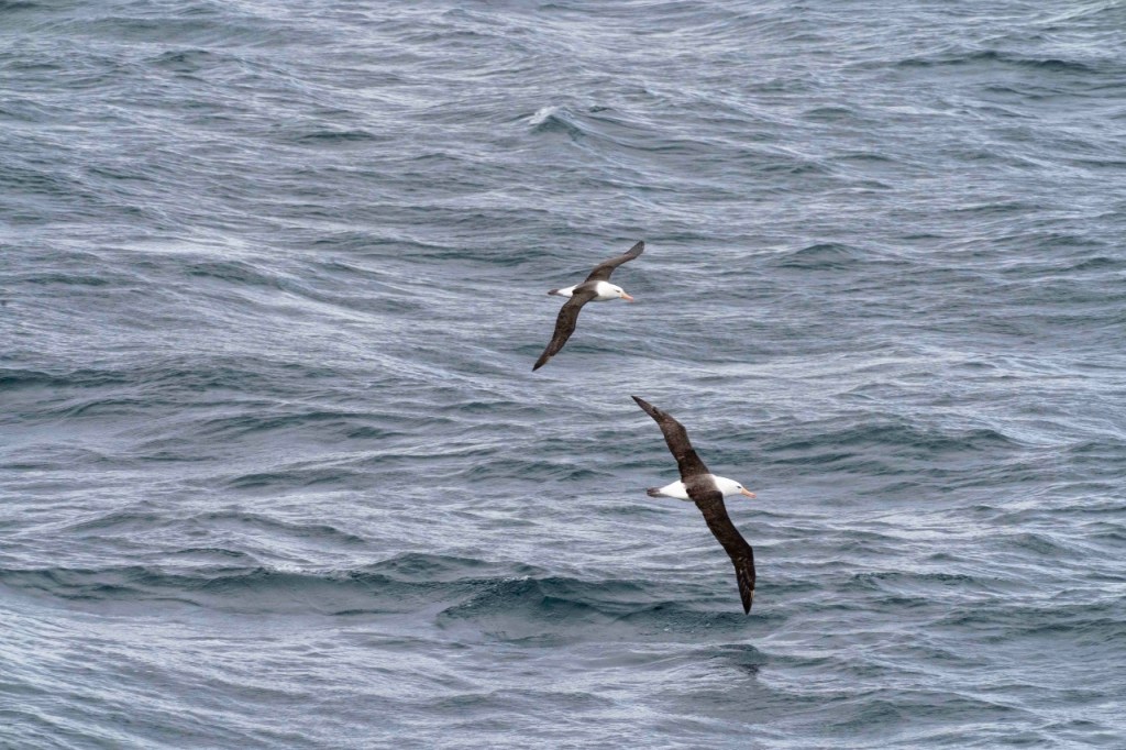 Onshore, we had a choice to do a “short” hike or take a Jeep ranger to Devil’s nose. We opted to hike thinking we can handle this no problem. The hike was uphill, against a stiff wind and more tiring than we expected especially walking in clunky boots. But when we entered the nesting grounds (after stepping into a Virkon bath first, of course) all was quickly forgotten. We were just a few feet from a colony of elegant Black-Browed Albatrosses co-existing with their punk rocker Rockhopper Penguins neighbors. The small cramped area was already crowded, so we jockeyed for position, stepping on rocks to get a peak over the tall tussock grass. We stood there and watched as the penguins delighted us with their antics as they hopped from one rock to another.