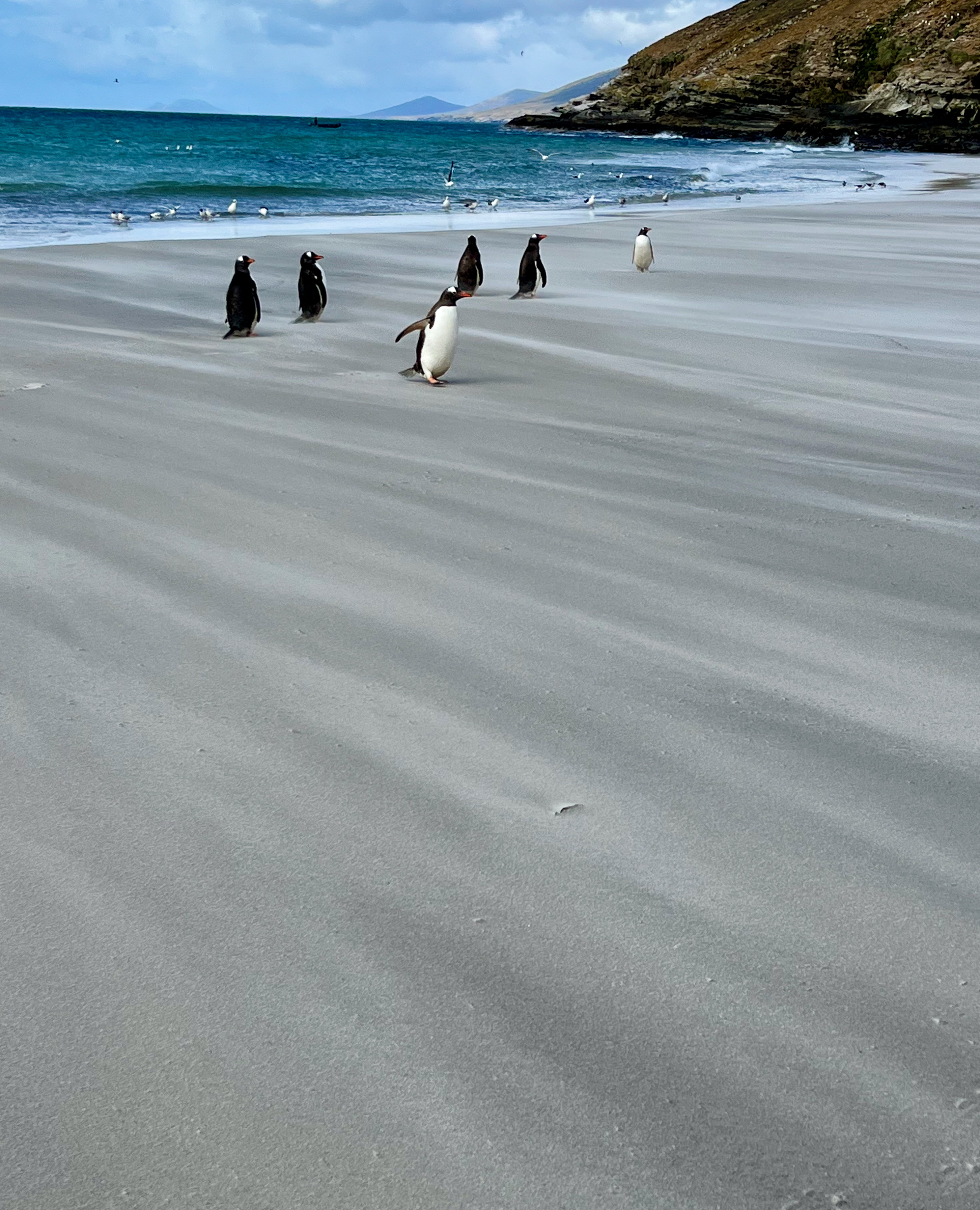 During lunch, the ship moved eastward to our next destination, Saunders Island, a working sheep farm but also home to four species of penguins: Gentoos, Magellanics, Rockhoppers, and King penguins, as well as non-waddling birds: giant petrels, skuas and shags.