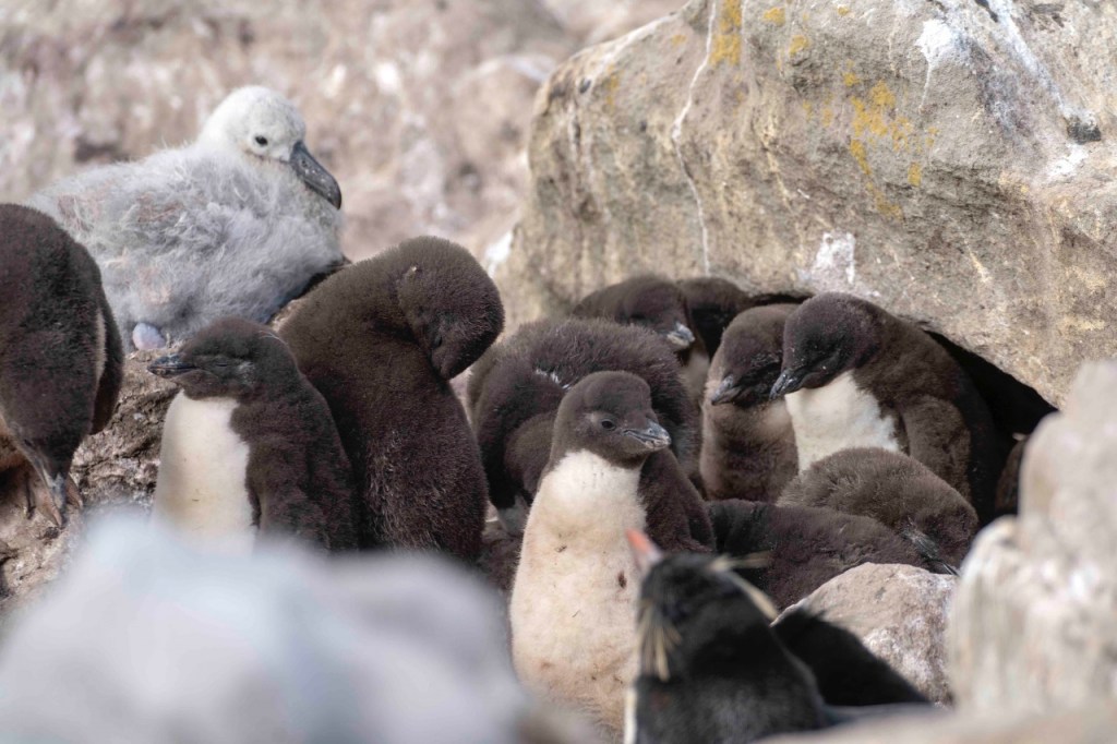 On the cliffs, there were lots of penguin chicks, but no shag babies, yet. Skuas and giant petrels kept swooping down attempting to steal chicks or eggs, but the nesting birds vehemently pecked at the intruders to prevent them from landing or grabbing any chicks.