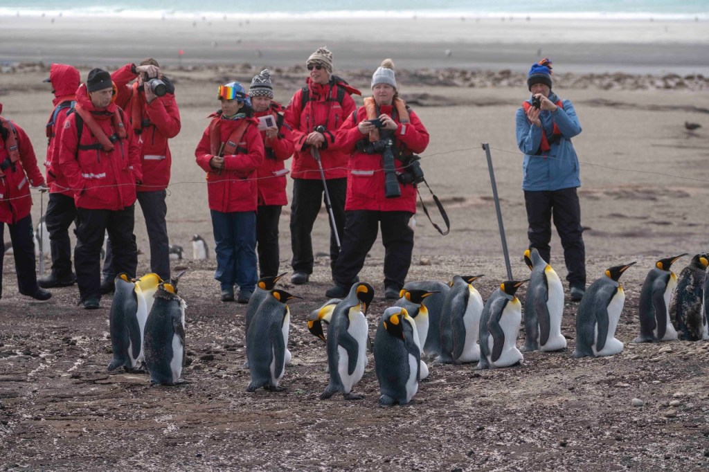 On the beach, there was a blur of red parkas taking pictures of Magellanic penguins walking to their hillside nest. Although the group was keeping the requisite 15 feet away, they were too busy taking pictures to notice that they inadvertently formed a circle, essentially blocking the penguins’ path. The bewildered penguins weren’t sure which way to go as they looked around, turning and twisting, seeking another path up. Only when a staff member asked the group to clear a path did the group finally move to make way for the penguins.
