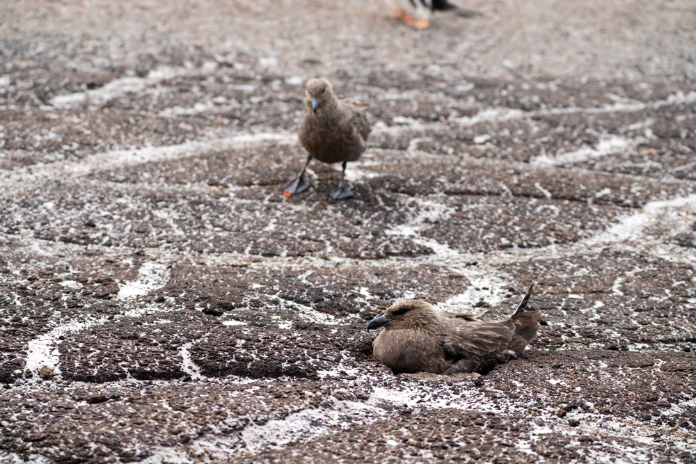 The majestic Kings, exuding grandeur, were fewer in number, and clustered in a tight group, most of them standing motionless with their bellies draped over their still unhatched eggs. Up close they were even more stately with orange plumes decorating their heads, though there were a few who were undergoing their catastrophic molt, looking rather shabby and quite miserable. As we were leaving, we were told to be careful to not trip over the lone skua that was incubating an egg.