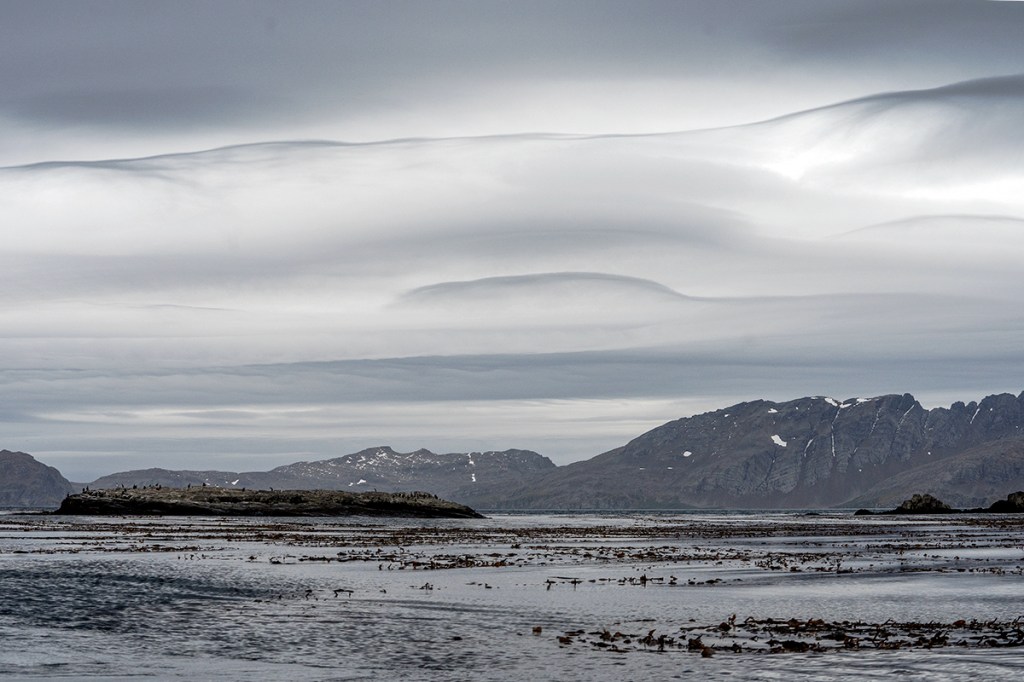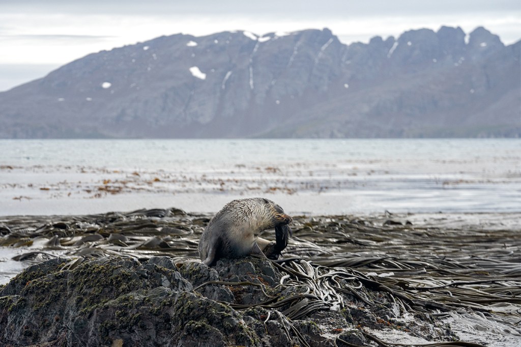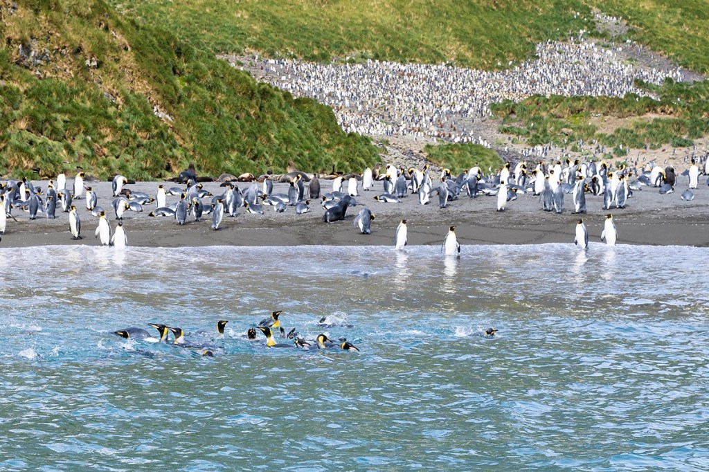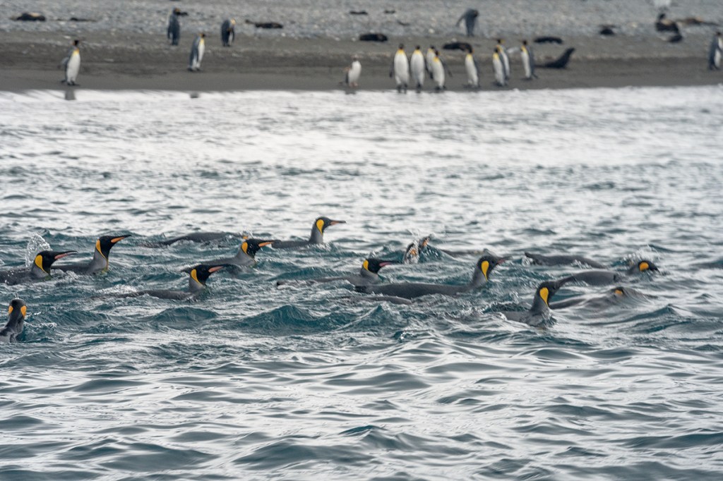 Alas, no terrestrial foothold would greet us this day, for Avian flu concerns and the teeming wildlife rendered landing prohibitive. Against a backdrop of snow-draped peaks, the shoreline hosted thousands of King penguins, their fluffy brown chicks almost attaining full regality. Adorable fur seal pups engaged in playful chases, while languid juvenile elephant seals reclined in repose. Over the aqueous expanse, rafts of penguins sailed and rolled, cleansing themselves before venturing out for sustenance, while majestic giant petrels bobbed with the rhythm of the waves. Amidst this theater of nature, a comical vignette unfolded—a young seal pup in pursuit of a bird, a dance of whimsy. Yet, in the shadowed corners, a somber scene emerged, as avian scavengers pecked at the remains of seal carcasses. And through it all, the constant hum of the kings’ trumpeting calls echoed in the crisp air.
