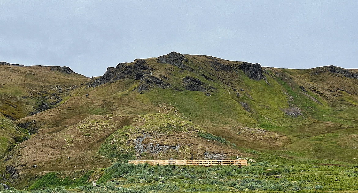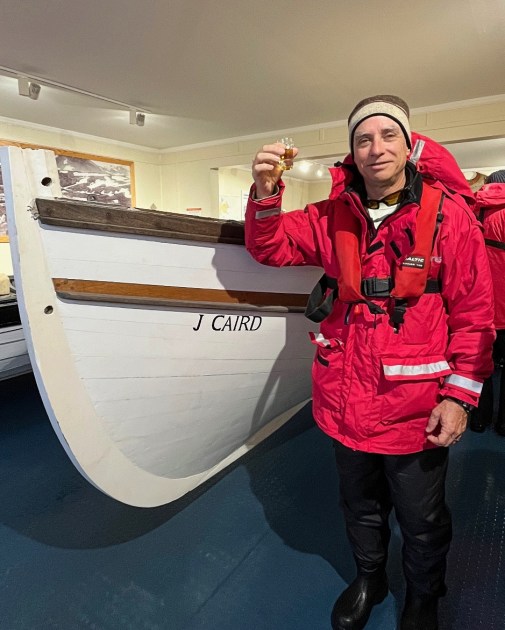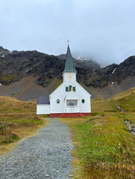 But, there’s hope. The decline in demand for whale products led to the demise of the whaling station, and now, whales are slowly making a comeback. Fur seals, once on the brink of extinction, have returned in greater numbers. Now the old settlement houses several museums, a gift shop and post office. A small museum exhibits a replica of the James Caird, the lifeboat which Shackleton and his men sailed from Elephant Island to South Georgia. Keeping with tradition, Gus raised a glass of whiskey in Shackleton’s honor and toasted the Boss. We had to view Shackleton’s grave from the zodiac since Avian Flu concerns had the cemetery on lockdown. A church visit included musical performances by our resident musicians, Jeff and Jacinthe.