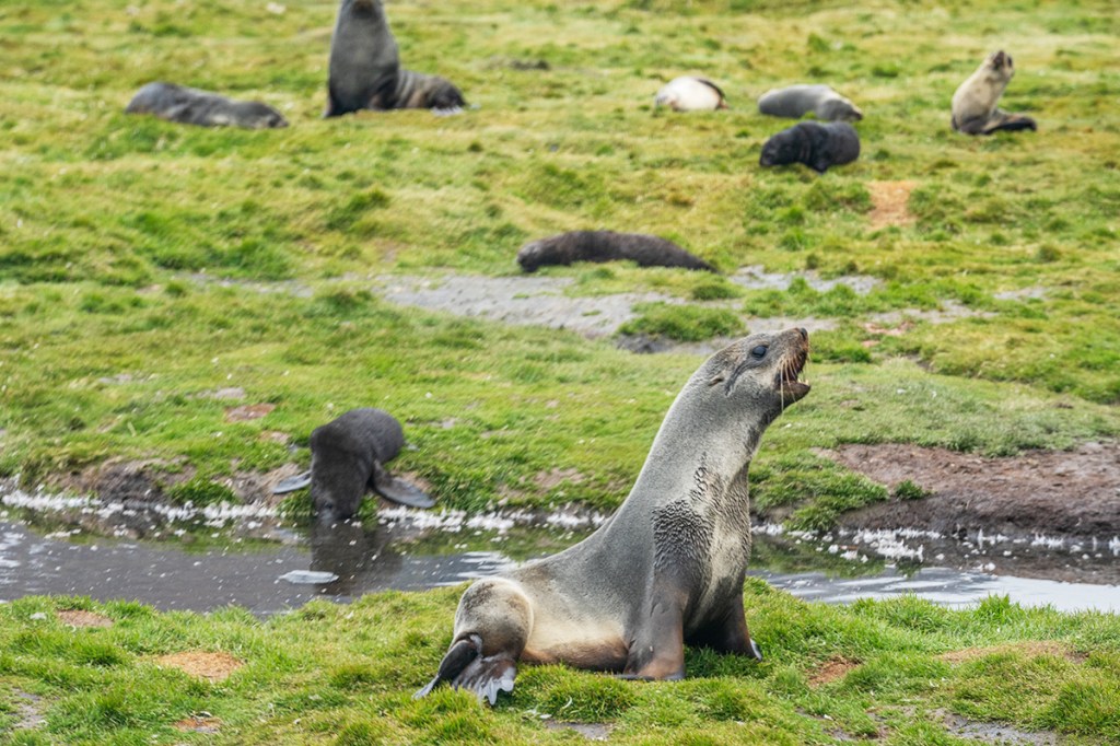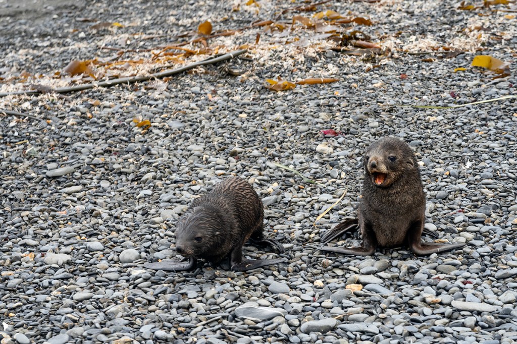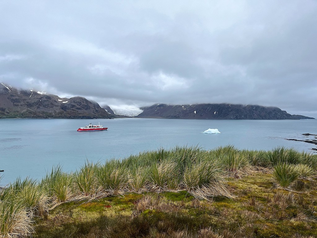 Peering down Fortuna Bay, we half-expected the ship to be a dot on the horizon, but there it was, anchored, tempting us. Meanwhile, a zodiac was zipping back and forth on the shore, taunting us, waiting to see if anyone would chicken out after the initial ascent. But nope, everyone just pressed on.