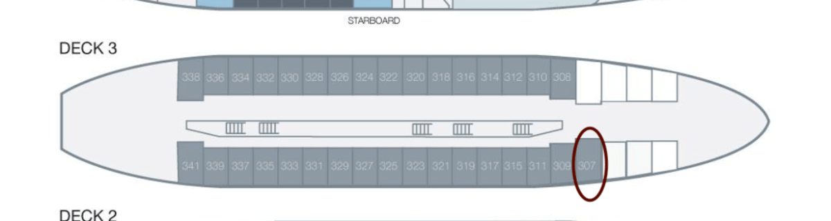 The cabin was cozy and comfortable, though not extravagant. The bathroom was tiny—there was barely enough room to turn around, so larger individuals might struggle to fit. This deck plan doesn’t show it but there was a room to the right of us.